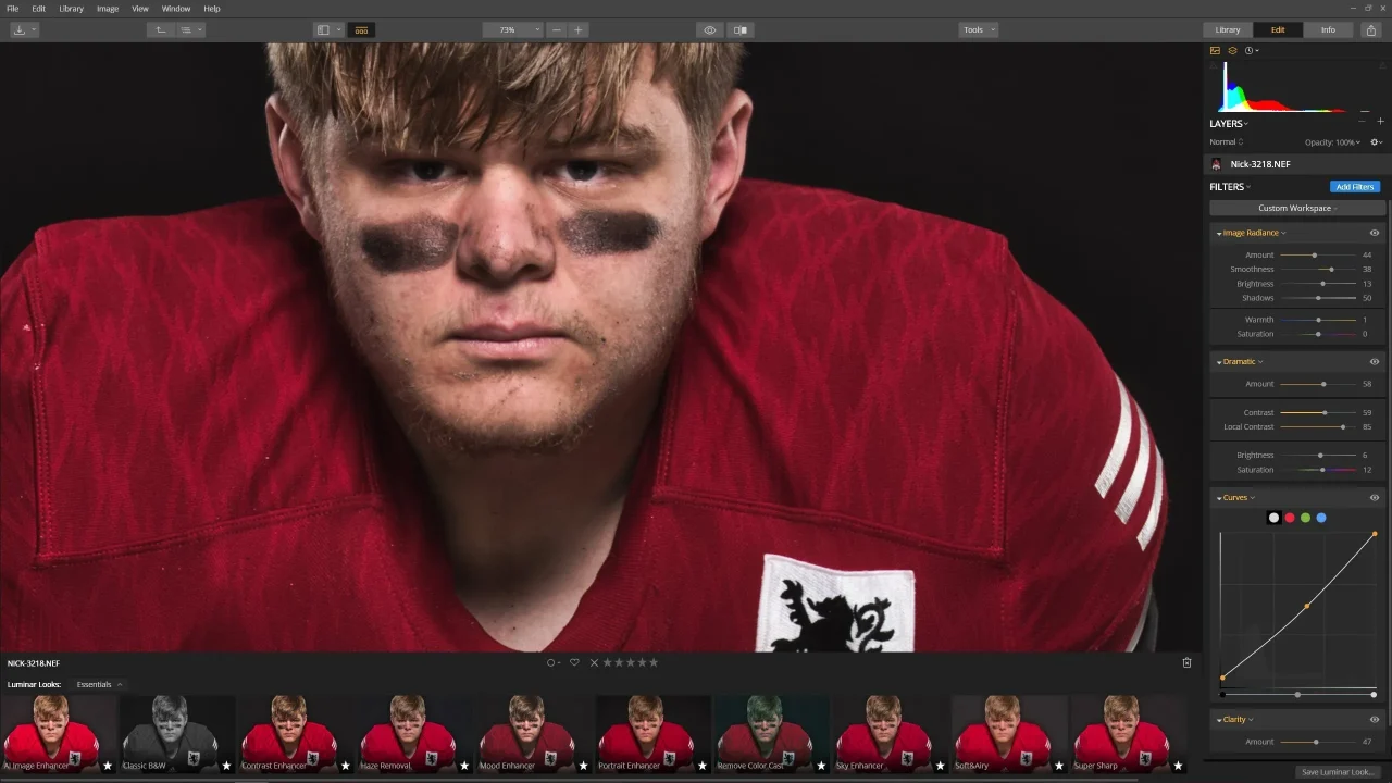 点击滤镜的可视化按钮(它看起来像一只眼睛),可以打开或关闭单个滤镜。检查设置以及添加到总体风格中的滤镜是如何组合在一起的,从而创建Luminar外观。这里是最棒的部分:你可以改变这些设置或添加额外的滤镜,然后保存为你自己的新的Luminar外观!