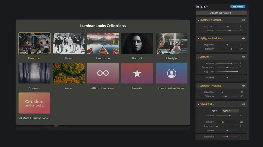 Luminar外觀由濾鏡以及用於每個濾鏡的設置組成的。它們也可以包括用於濾鏡或圖層的混合模式和不透明度的改變。 Luminar 3有超過50種外觀的豐富收藏,這些外觀由來自世界各地的專業攝影師和它的教育團隊的會員製作完成。選擇一個Luminar外觀並且把它應用到圖片上。如果外觀的效果過於強烈,可以調整數量滑塊。