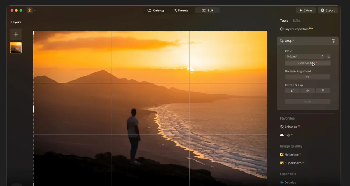 Photoshop allows for faster processing and editing because it has more functions than a camera. Luminar Neo includes everything you need for cropping and changing the aspect ratio. This allows you to simply convert any size to the 5×7 format while retaining necessary data. Here’s how you do it.