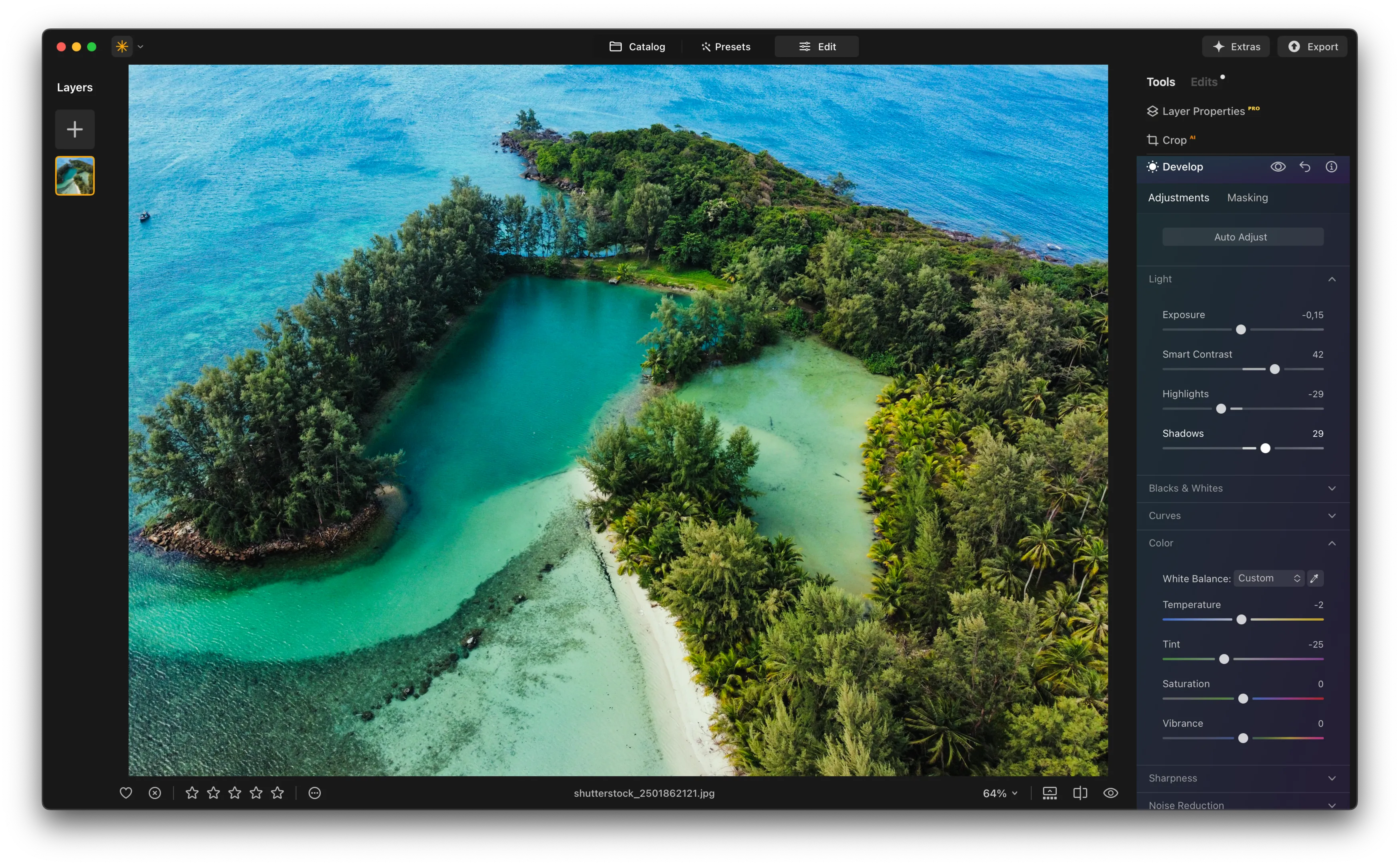 After uploading your drone photos in Luminar Neo, the first thing to do is correct technical flaws and enhance overall image quality. With the AI-powered tools, the workflow is designed to be seamless and effective while maintaining a natural look.