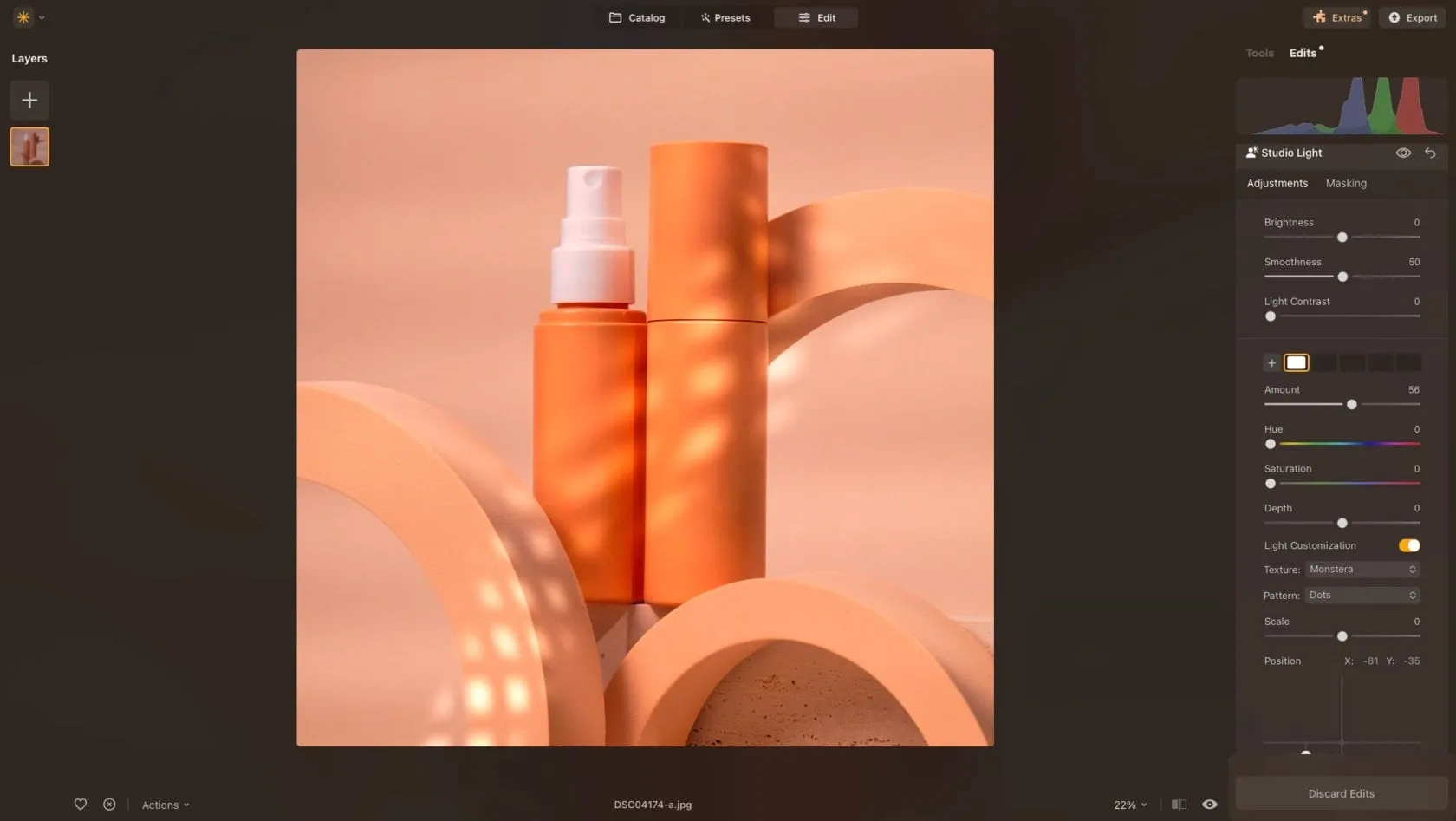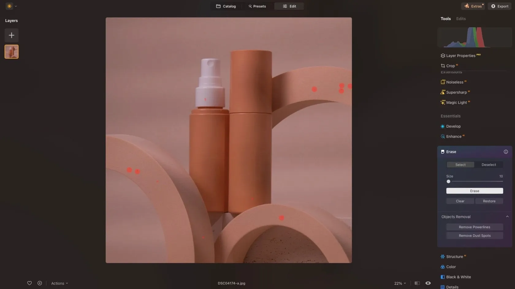 Luminar Neo’s AI Erase Tool allows you to remove any debris that finds its way onto your set. No matter how careful you are, dust will inevitably appear either on your product or on your background and props. Zoom into your image and carefully examine each section and simply click on the dust and debris. Once you’ve made your selection, press erase, and your image will be cleaned up. Another handy feature of the Erase Tool is the “Remove Dust Spots” option, which automatically detects and removes dust spots, saving you time.