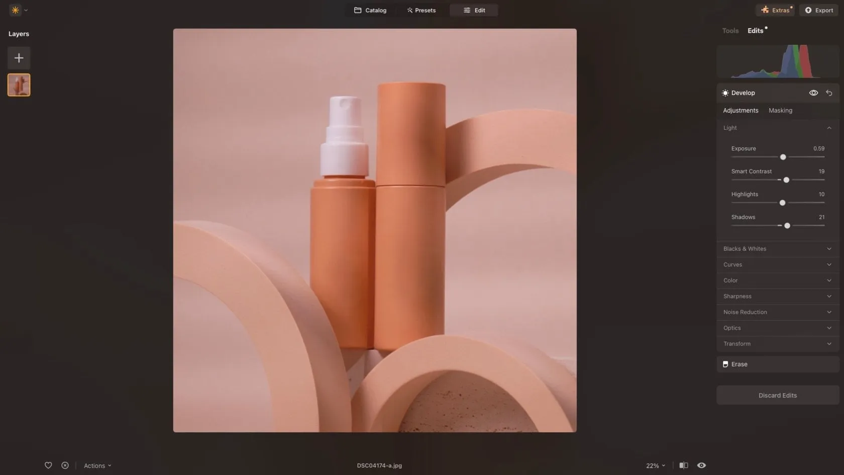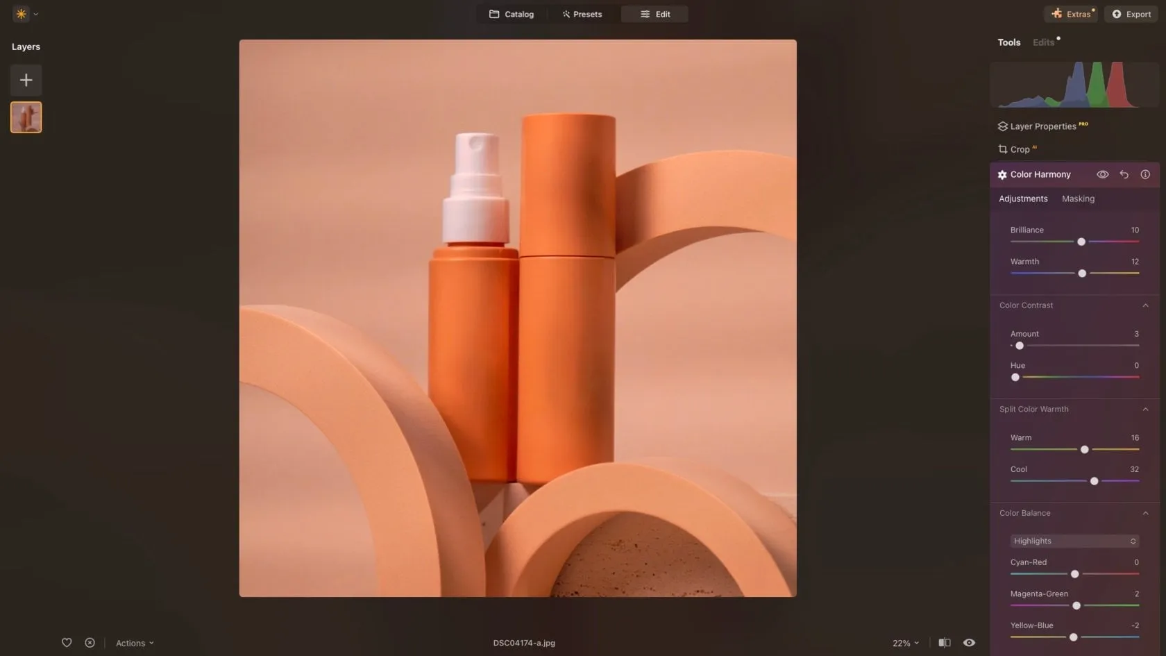 Contrast: Contrast is crucial for a well-edited image. You’ll want to ensure there is significant contrast between the background and the product to make it stand out. One effective way to adjust this is by using Luminar Neo’s Supercontrast tool, which allows you to fine-tune the contrast in the highlights, midtones, and shadows separately.