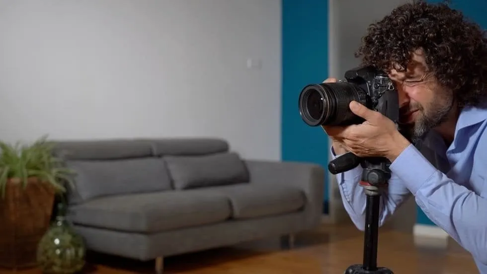 For a balanced shot, align your camera with a main feature of the room, like the back wall. This setup helps your photos look straight and even. When shooting a larger space, lower your camera to waist height to give a more natural perspective, as if you are in the room.