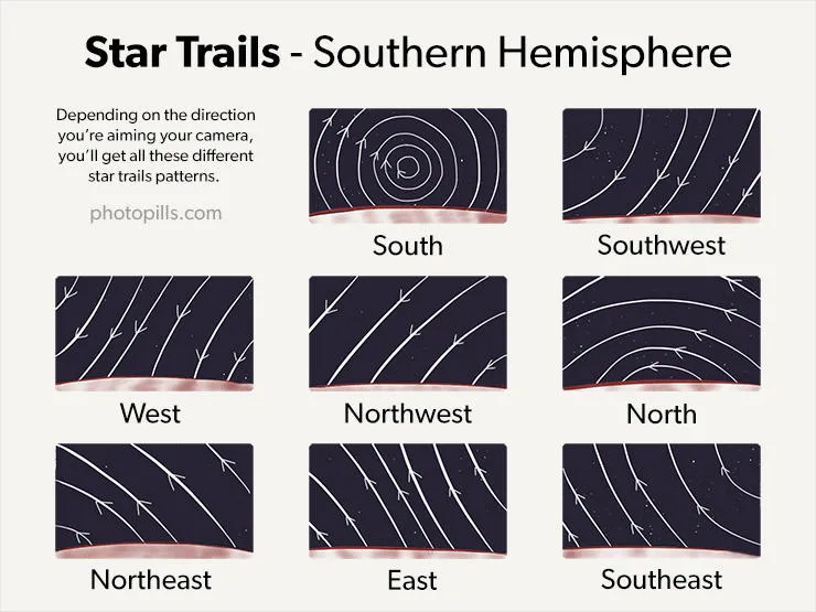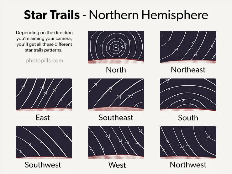 In the Northern Hemisphere, you’ll have the impression that the stars move counter-clockwise. Depending on the direction you’re aiming your camera, you’ll get all these different Star Trails patterns.