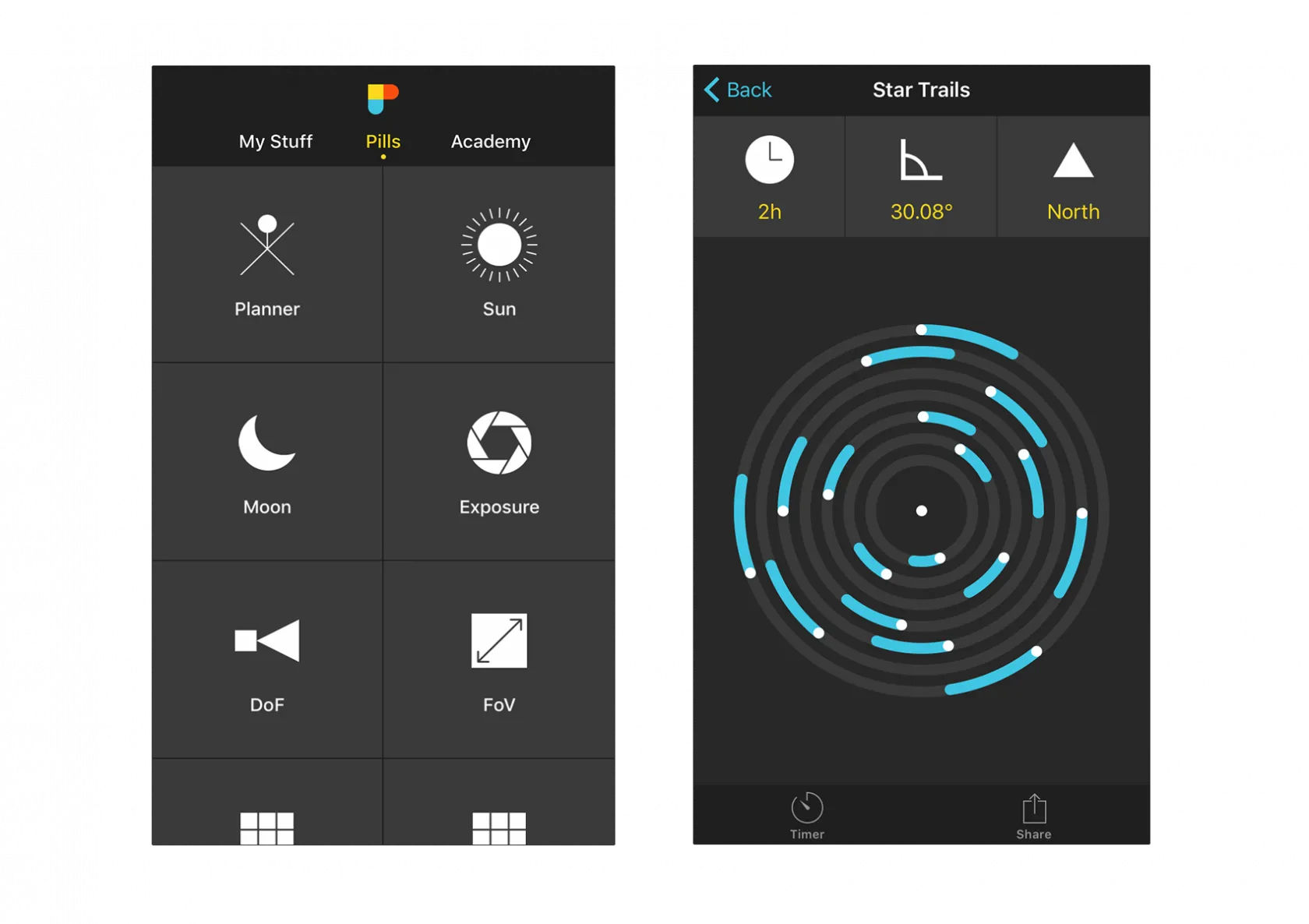 Go to PhotoPills. In the Pills menu, scroll down and tap on Star Trails, and then drag your finger from left to right to see the Star Trails length grow.