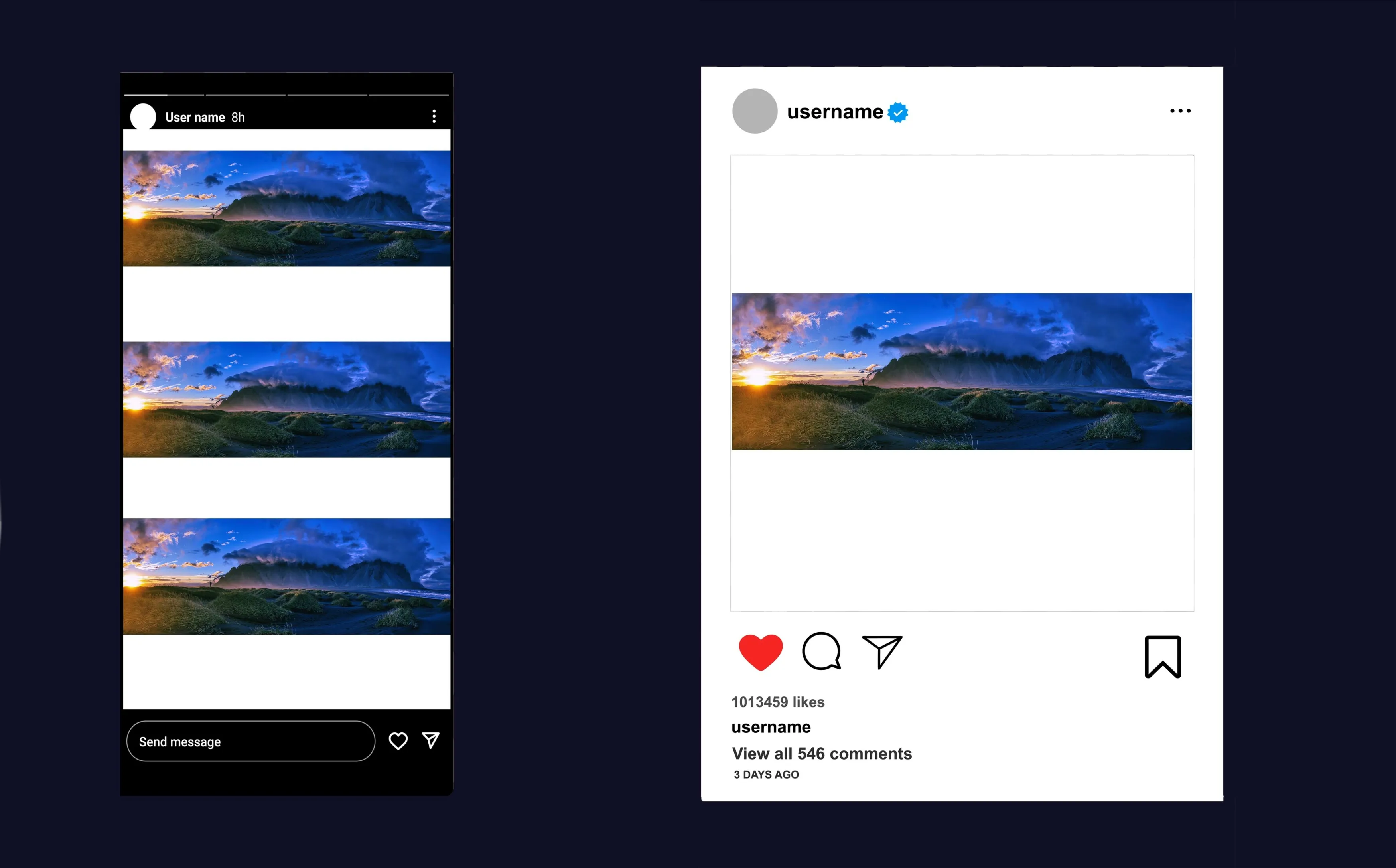 Landscape Posts: For a wider view, like a sunset or cityscape, landscape posts are perfect. They should be 1080 x 566 pixels. These are wider than they are tall, kind of like looking out a wide window.