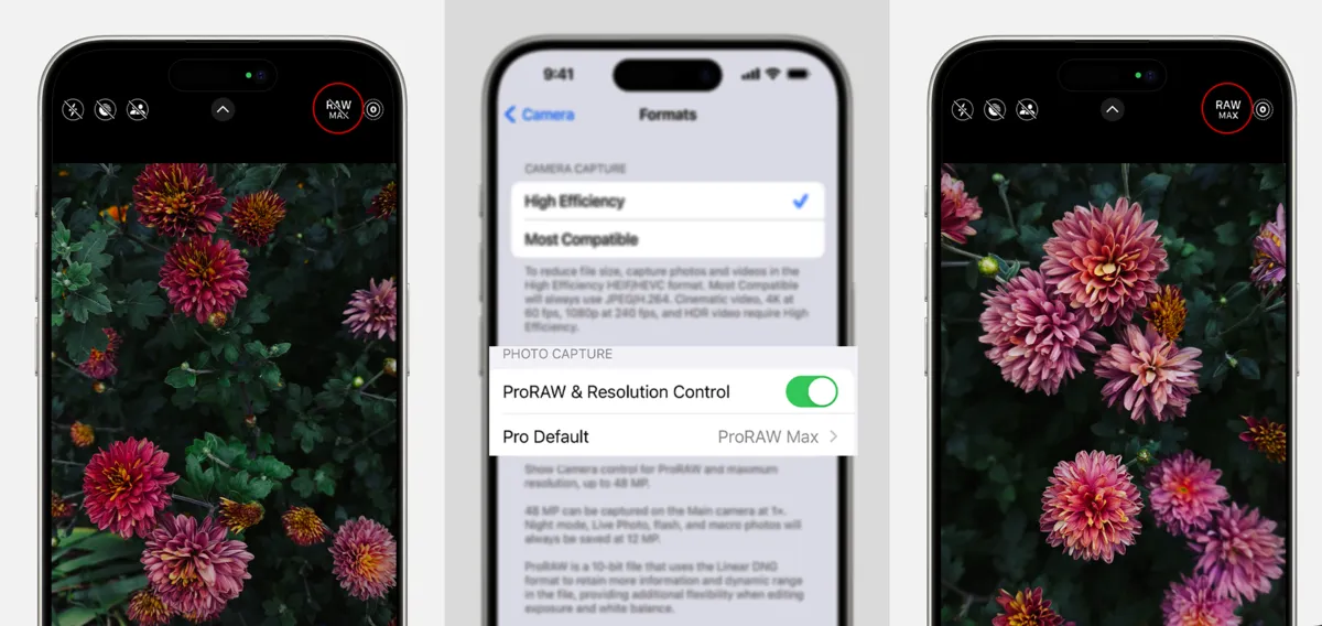 Under the “Photo Capture” section, toggle on Apple ProRAW.