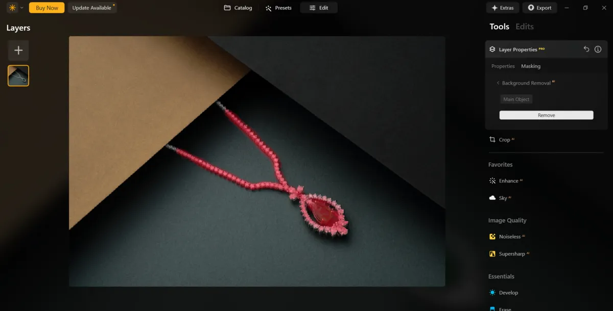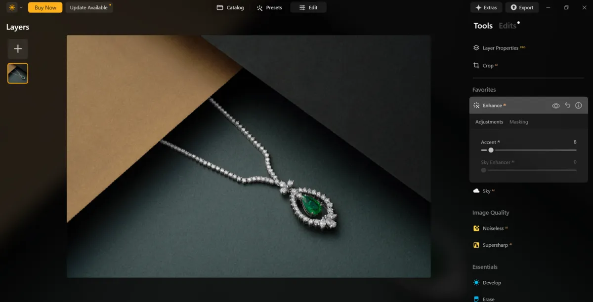 For e-commerce image editing, use Luminar Neo, an AI photo editor, to elevate your jewelry photos. Start with basic tweaks like brightness and contrast to ensure your jewelry looks its best.