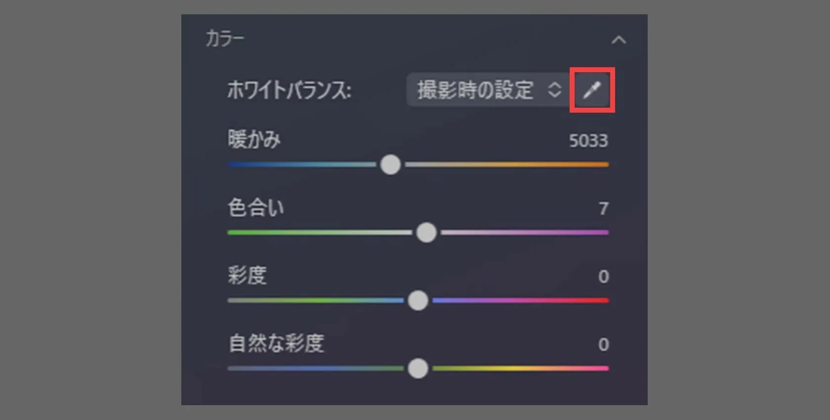 ホワイトバランスの項目のスポイトマークを選択してください。