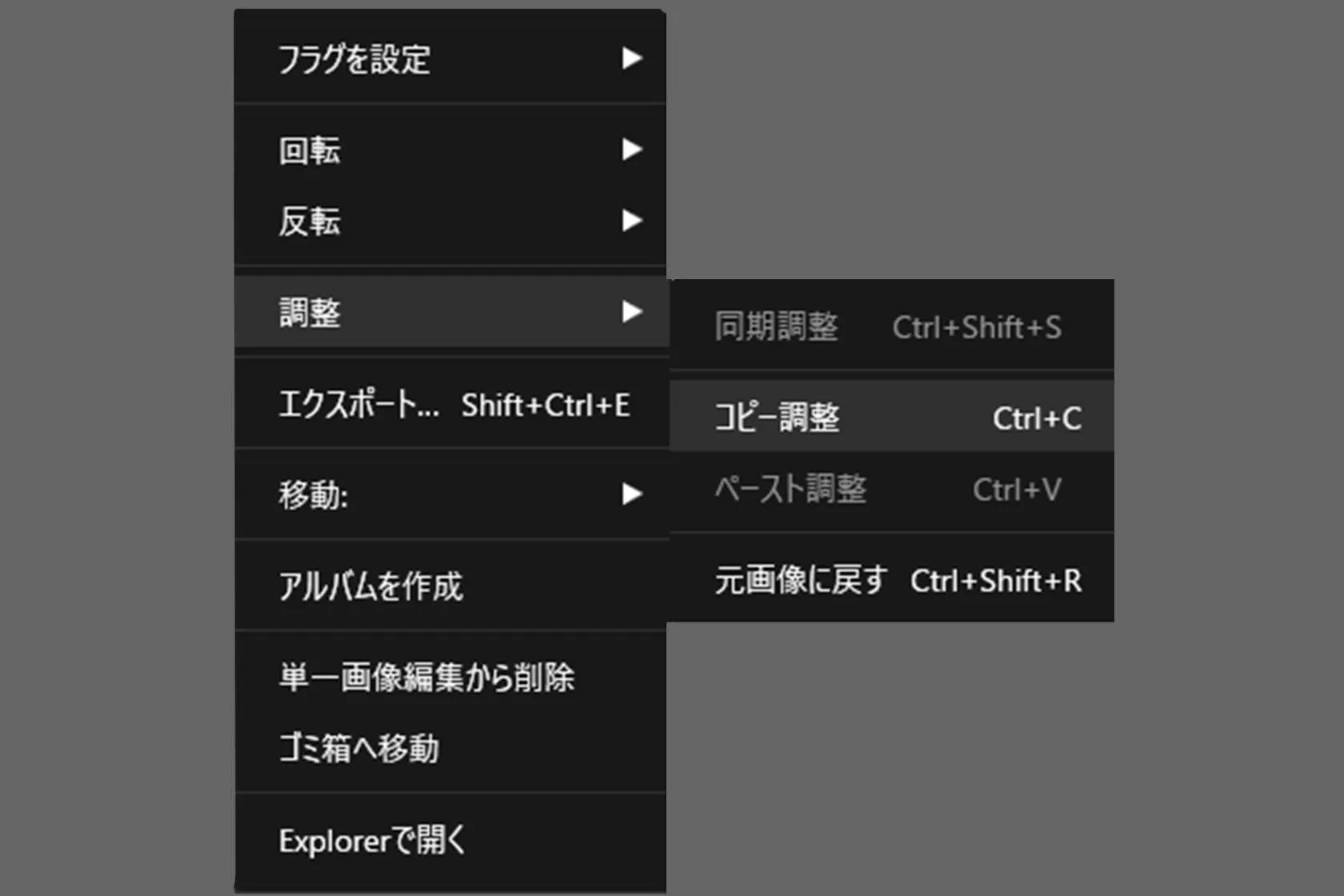 適用したい写真を選んで右クリックメニューから「ペースト調整」を選びましょう。