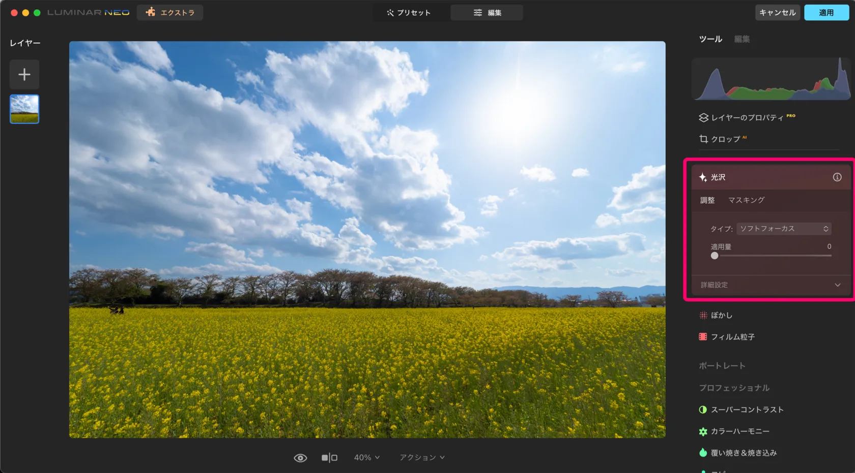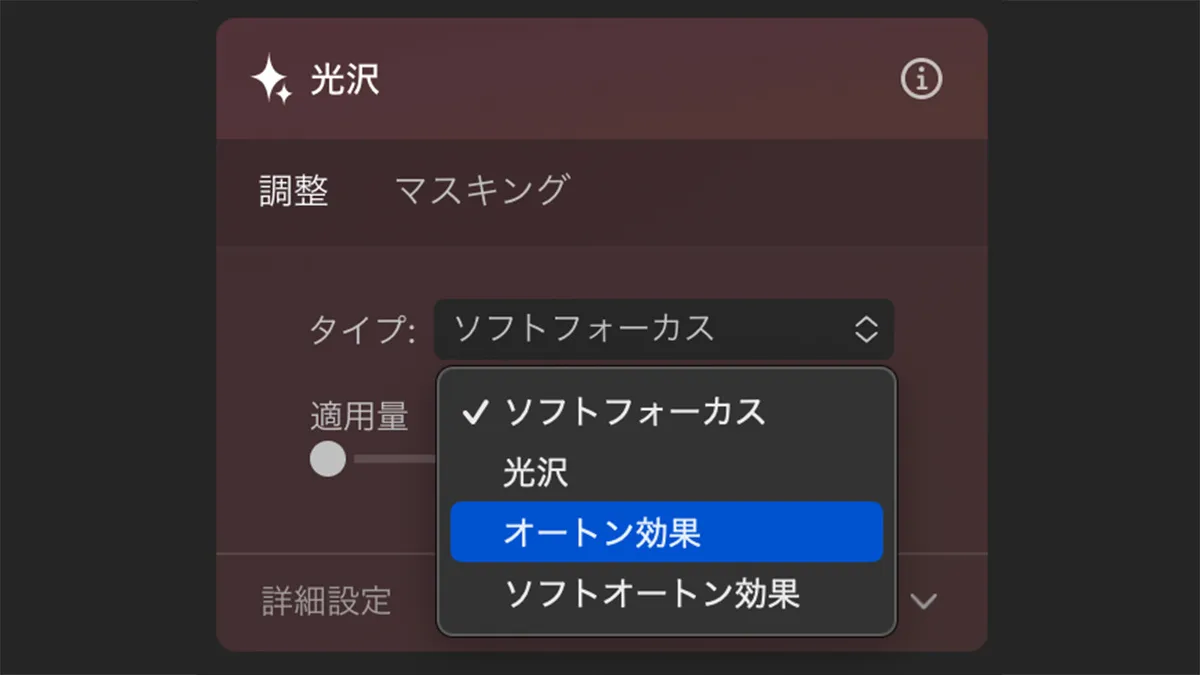 光沢ツールにはソフトフォーカス・光沢・オートン効果・ソフトオートン効果の4種類の異なるタイプを選択可能です。