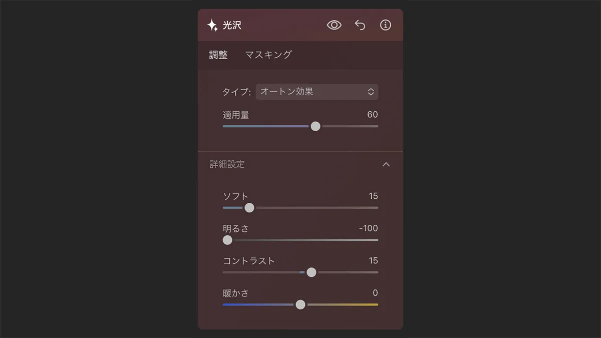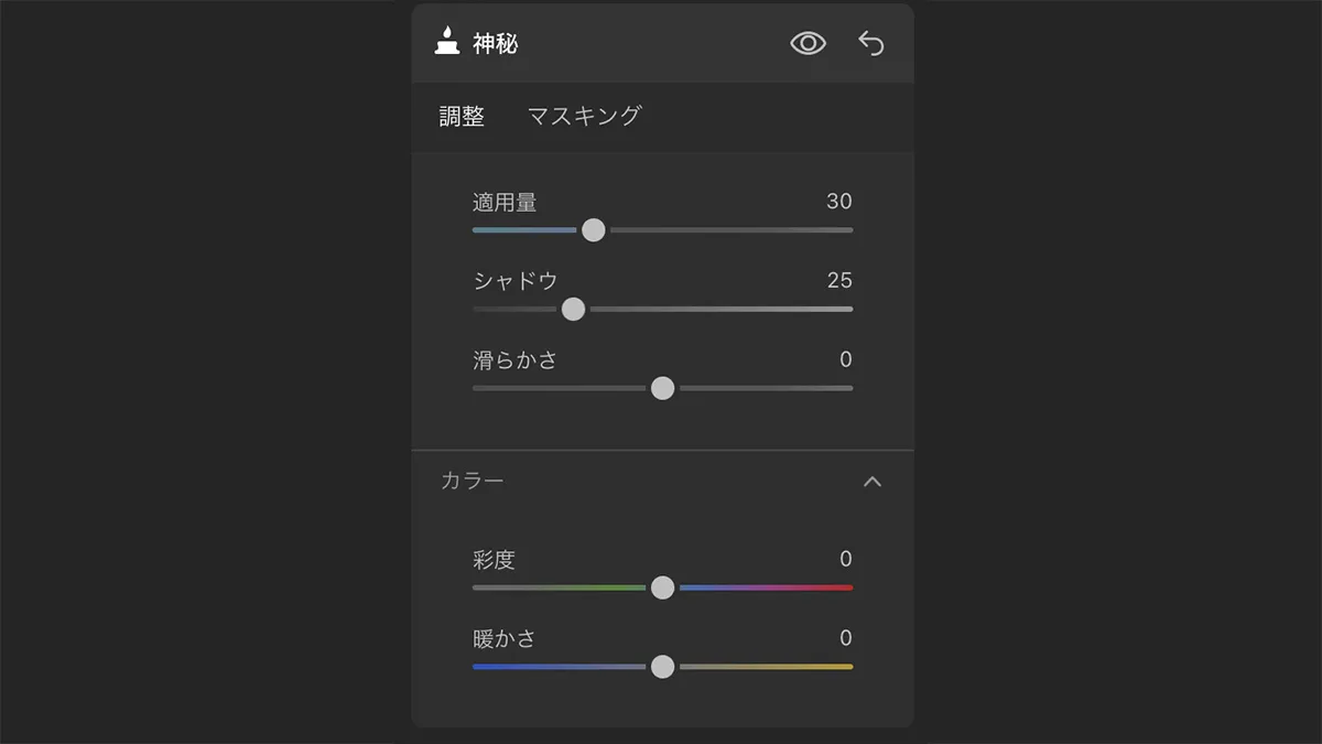 ちなみに神秘ツールでは適用量以外に、シャドウ・滑らかさ・彩度・暖かさの調整も可能です。
