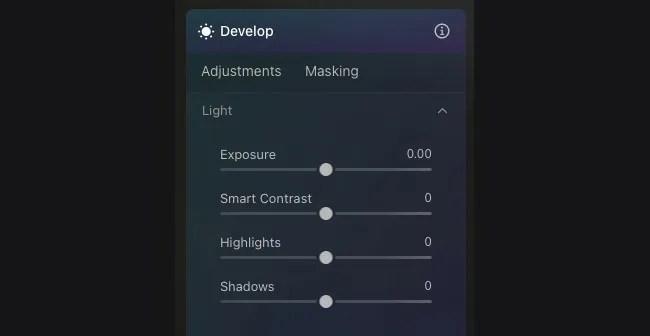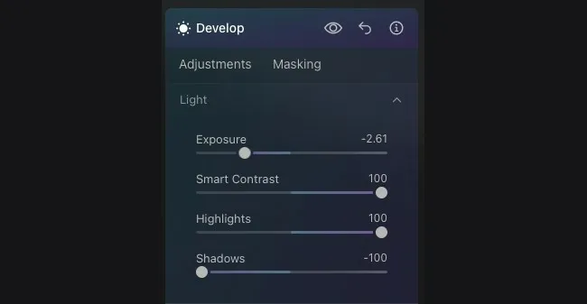 暗い写真を作るための最も簡単な方法は露出を下げることです。Luminar Neoでは「現像」の項目に露出があります。