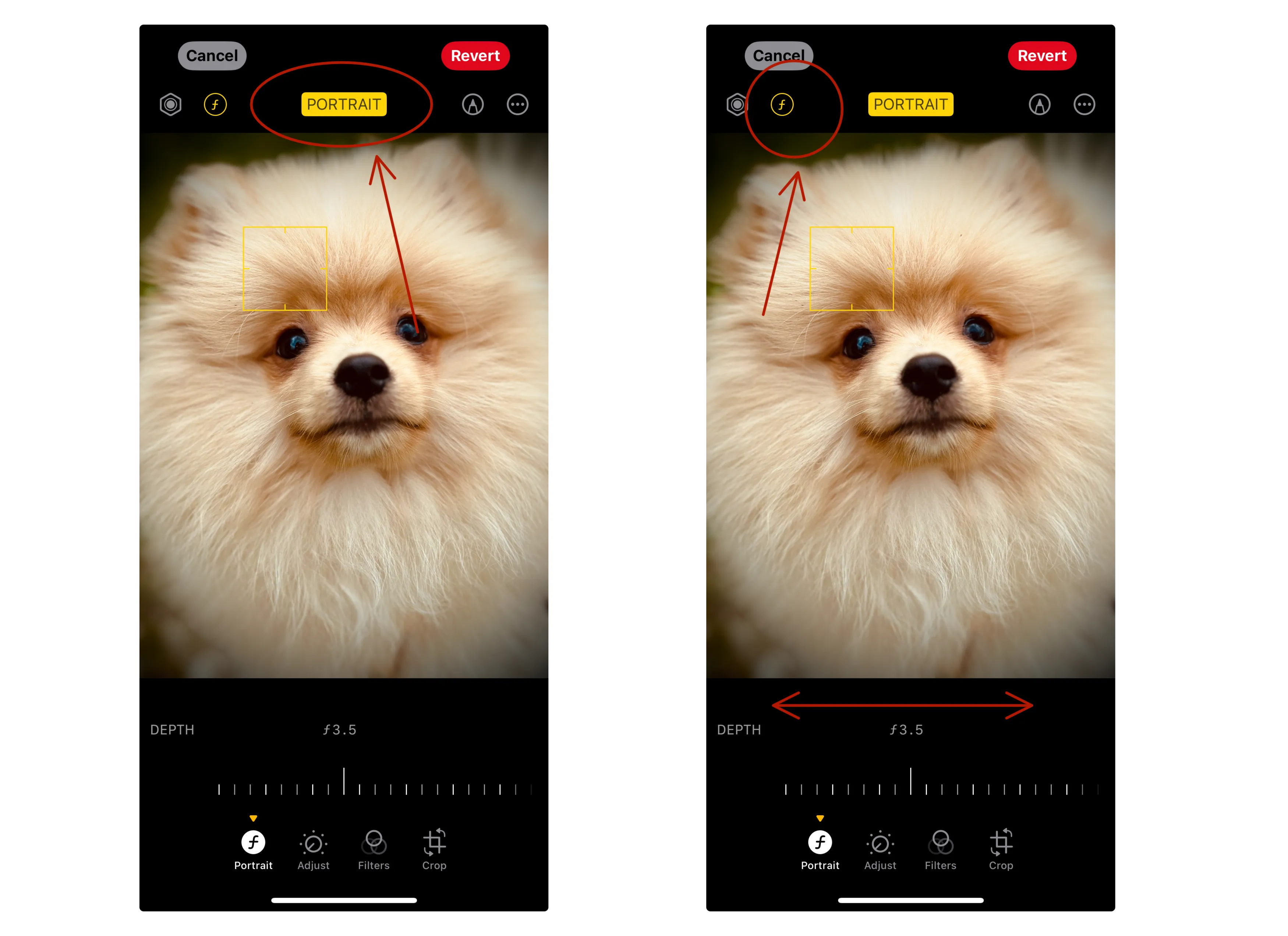 If you took a great shot but the portrait mode didn’t work correctly, open the photo in the album and click Change. By clicking on the yellow “Portrait” window at the top, you can turn off portrait mode on the created photo, and by clicking on f on the left, you can change the level of background blur after shooting.