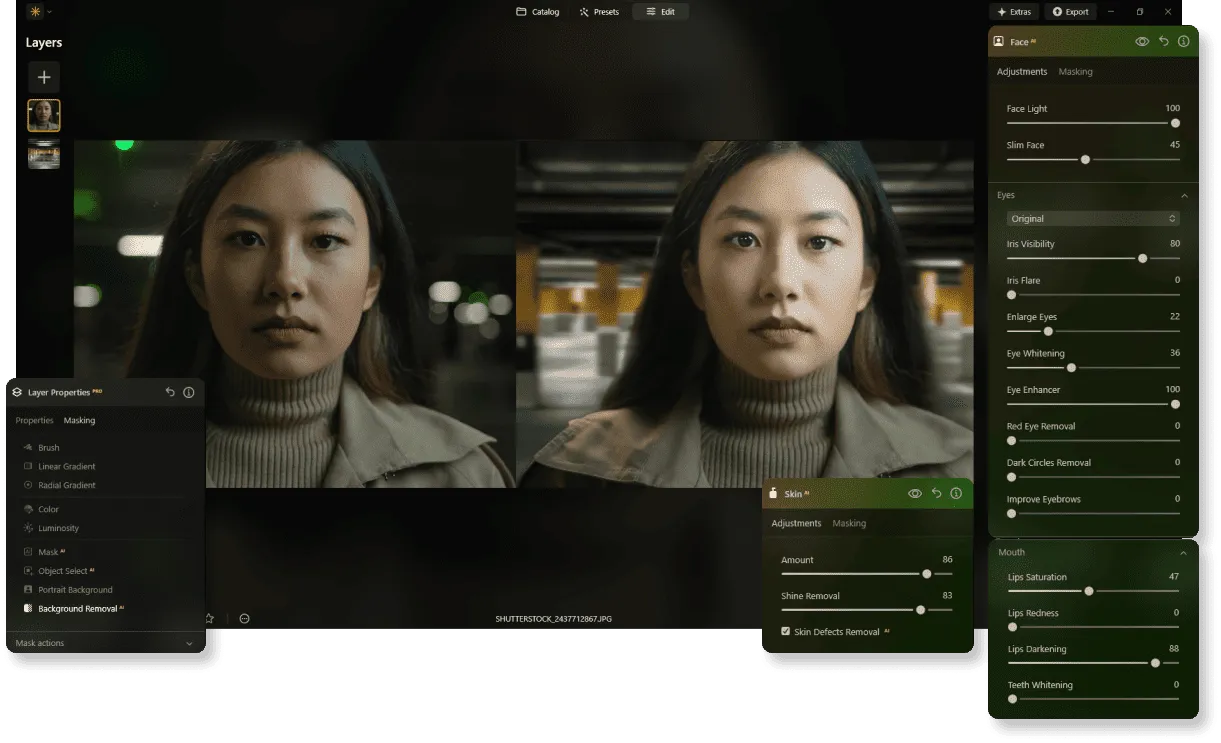 사진 편집이 필요하다면 Luminar Neo를 사용해 보시길 적극 추천합니다. 인물 사진을 손쉽게 향상시킬 수 있는 AI 기반 기능으로 인해 강력한 인물 사진 편집기로 유명합니다. 몇 번의 클릭만으로 피부 질감을 매끄럽게 하고, 눈을 밝게 하고, 배경까지 변경할 수 있는 Luminar Neo는 인물 사진을 빠르고 효율적으로 다듬고자 하는 모든 사람에게 없어서는 안 될 필수 도구입니다.