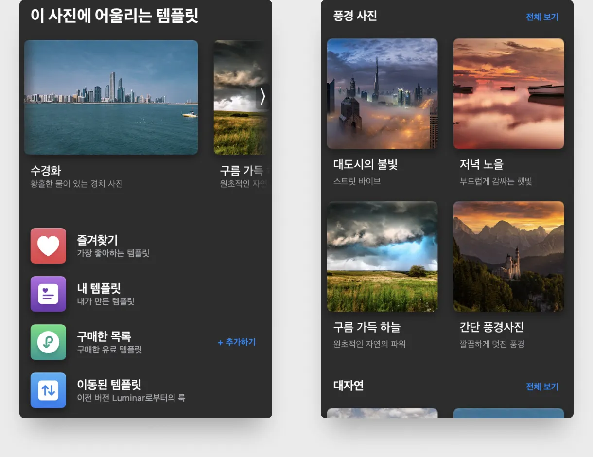 템플릿 탭에서 발견할 수 있는 흥미 진진한 개선사항이 많이 있습니다! 템플릿은 혁신적인 LuminarAI 워크플로우의 필수 부분입니다. 따라서 템플릿 환경을 개선하기 위해 지속적으로 노력하고 있습니다. LuminarAI 업데이트 2에서는 사진을 위한 완벽한 템플릿을 훨씬 더 빠르게 찾을 수 있습니다.