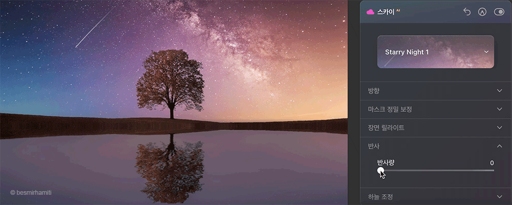 신규 스카이는 장면의 각도와 깊이에 자동으로 맞춰지게 되므로 아주 작은 디테일까지 놀라운 결과를 만들어냅니다. 신규 스카이로 교체하고 난 뒤 반사 슬라이더를 사용하여 반사 강도를 원하는대로 조정합니다.