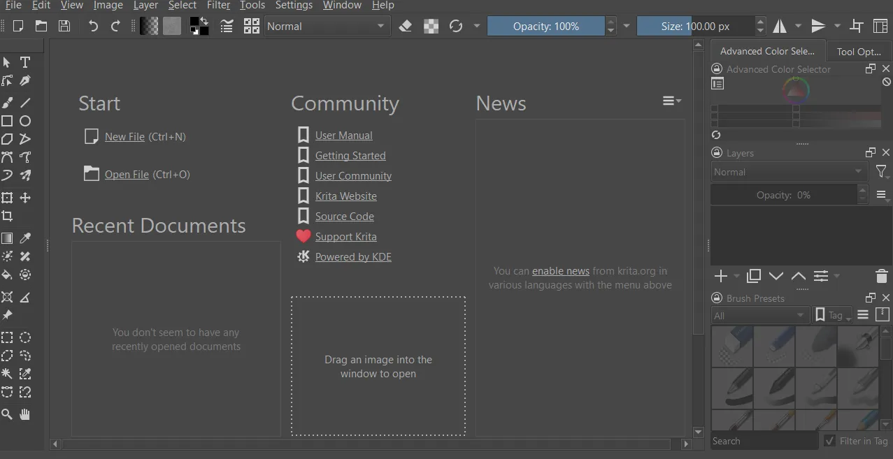 Krita’s workspace is made in a minimalist way, but stylishly. Nothing is superfluous: on the left is the toolbar, and on the right are windows with a palette, brush profiles, and information on layers. You can change the design theme in the settings. Clicking on the link New File (or the standard key combination Win + N), we see a few templates: textures, templates for cameras, the ability to create comics, animation, etc.