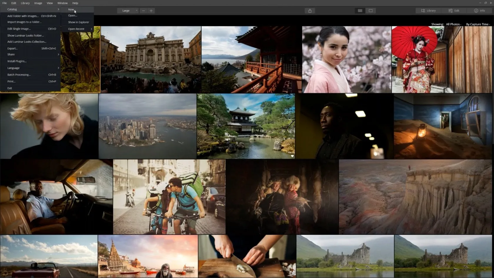 To understand how we are organizing and keep track of our Luminar catalogs, let’s create a new catalog on our fastest drive. Here you can see I already have a few catalogs in this folder. Create a new catalog and name it My Main Collection. Luminar creates a new empty catalog. From here, we can add a folder of images. The first time adding images takes a little longer because Luminar is creating thumbnails of the images to make previewing faster.