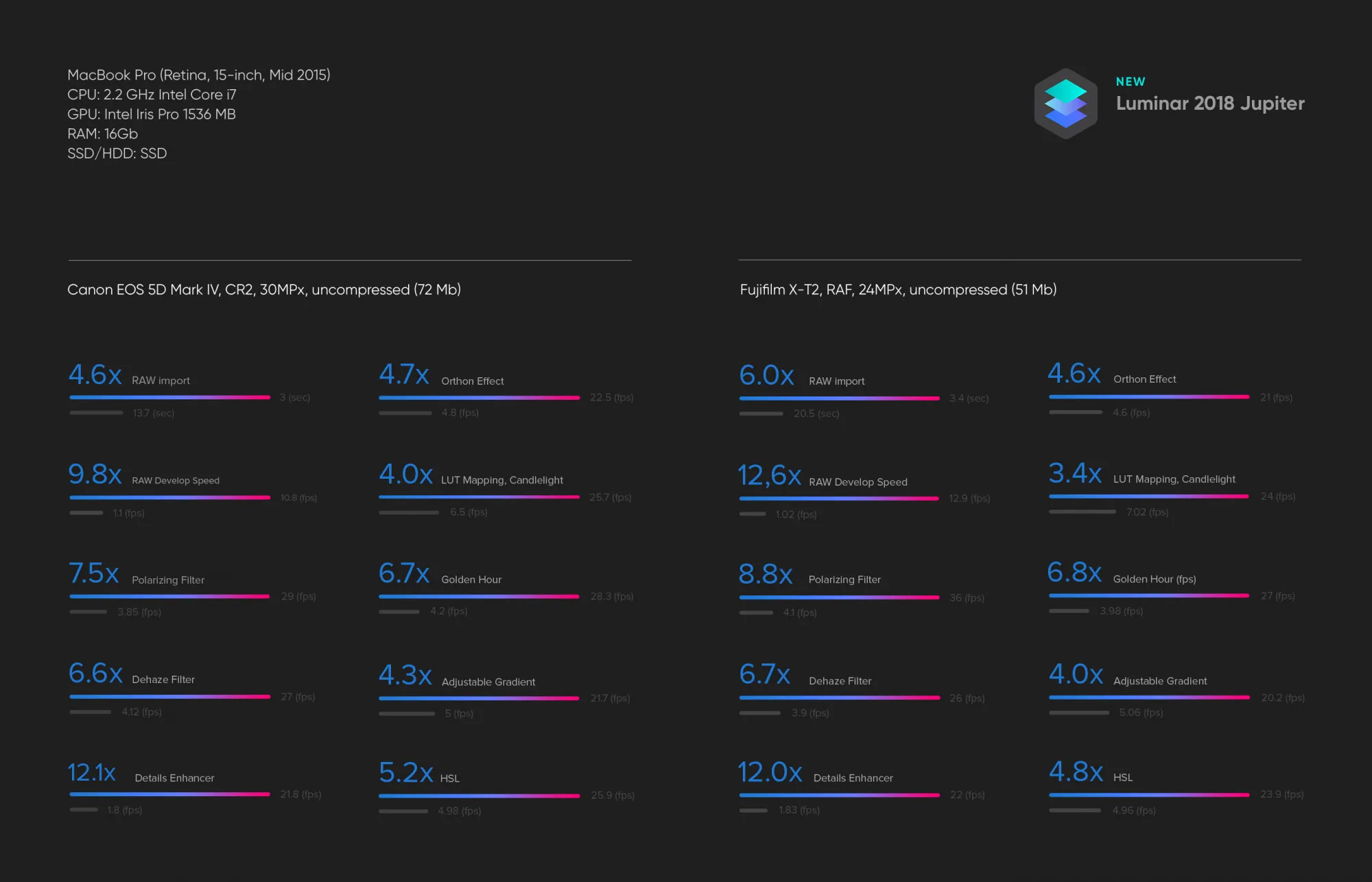 Have plenty of RAM and a fast video card? Luminar better uses your system for faster performance with many operations seeing significant boosts.