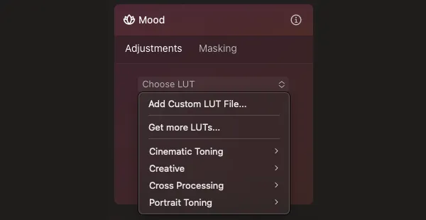 Click “Choose LUT” in the Mood Tools panel to display five LUT categories: Custom LUT, Cinematic Toning, Creative, Cross Processing, and Portrait Toning.