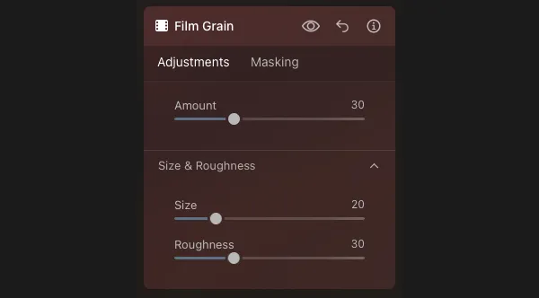 This is fine in terms of colour, but to create a grainy feel similar to analog photography, use the Film Grain tool and set the amount to 30.