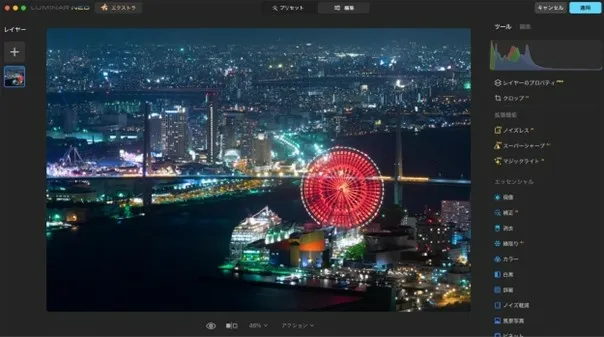 Thanks to the effects of the Mystical tool, a night-view photo of the cityscape that shines dreamily has been created.