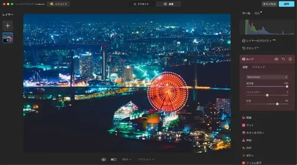 This time, I used the Creative LUT “Manhattan” and set the amount to 100 and the saturation to 30, resulting in a night view photo with a slightly matte and cool atmosphere.