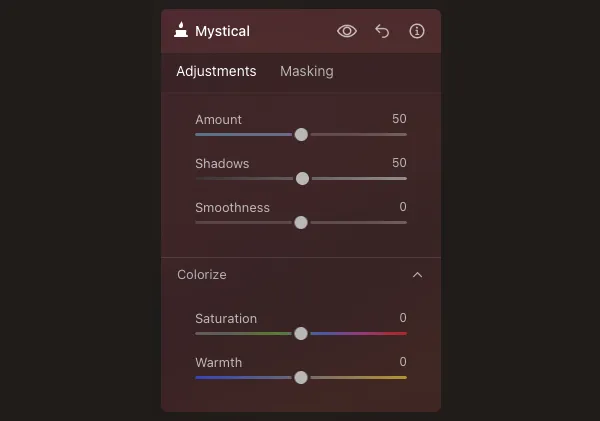 This time, to add more sparkle to the photo, I added the Mystical tool and set the amount to 50 and the Shadows to 50.