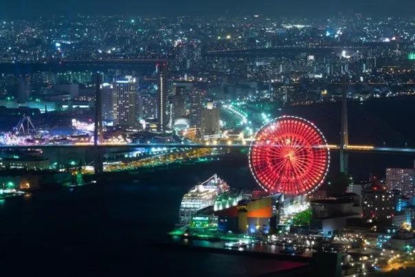 The photo above is a night view of Osaka Port from the Sakishima Government Building Observation Deck (commonly known as Cosmo Tower) in Osaka. The giant Ferris wheel of Tempozan and Kaiyukan are in the foreground, and the cityscape of Osaka is in the background.