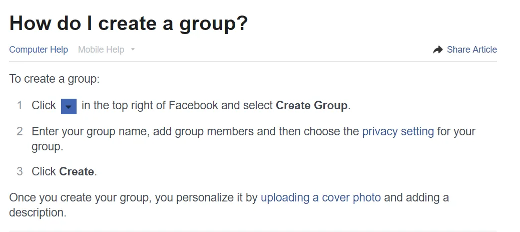 Now that you know how to create a photography page on Facebook, let’s find out how to create a Facebook group. Just follow the instructions in the screenshot below from the Facebook help section. Remember to choose a great Facebook group photo to attract followers, especially if your group is closed.