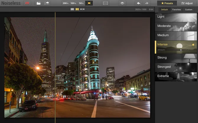 Most Mac users will find Noiseless presets are all they need, since they offer the quickest result. For those a little bit more daring, Noiseless brings powerful adjust tools to change an image’s noise reduction (color, luminance, and smoothing); structure (amount, radius and protection); filter (highlights, midtones, shadows, and details); and overall opacity. When you find a combination of parameters you like, save it as a favorite.