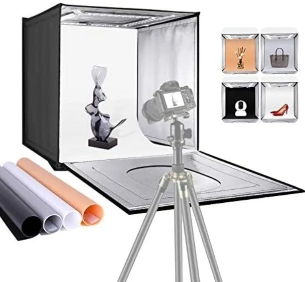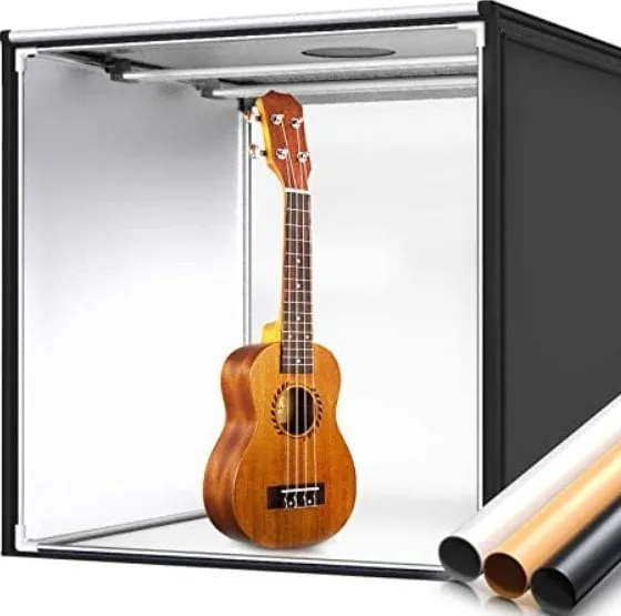 Deze witte lichtbox is een van de beste basissets om mee te werken. Je koopt hier niet alleen een lichtbox, maar ook verlichting met kleurcorrectie en de mogelijkheid om elk gewenste achtergrond te gebruiken. Dit biedt je veel creatieve vrijheid. Daarnaast is het een uitstekende keuze voor beginners, want je krijgt er ook een handleiding bij met fotografietips. Het is een klein model, maar erg handig en makkelijk mee te nemen.