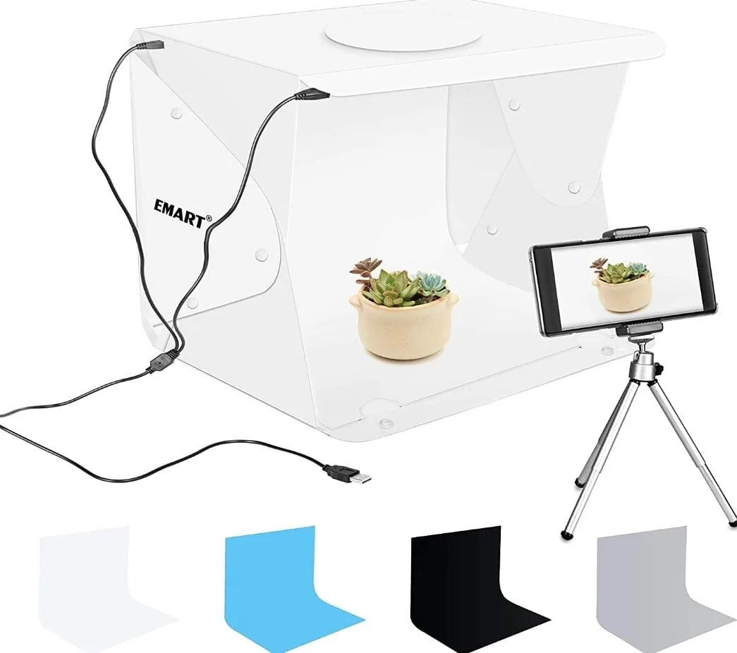 Dit is een van de beste opties – deze lichtbox voor productfotografie zorgt voor veel geslaagde foto’s! De gelijkmatige verlichting wordt verzorgd door een LED-strip en de ondoorzichtige wanden voorkomen dat extern licht het beeld beïnvloedt. De lichtbox beschikt over helderheidsregeling en meerdere openingen voor eenvoudige fotografie vanuit verschillende hoeken. Dit apparaat is opvouwbaar tot een draagtas en dus zeer mobiel. Er worden vier achtergronden meegeleverd, maar je kunt er meer bijbestellen als dat nodig is.
