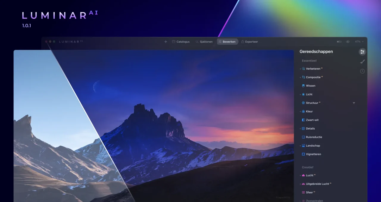 In LuminarAI 1.0.1 heeft het bewerkingspaneel een handigere lay-out gekregen. Je vindt nu alle tools voor het bewerken van je afbeeldingen in één lijst. De essentiële, creatieve, portret en professionele tools zijn verdeeld in categorieën met elk een eigen kleur en je hoeft niet meer te switchen tussen verschillende tabbladen. Je hebt alle tools die je nodig hebt voor het creëren van meesterwerken binnen handbereik.