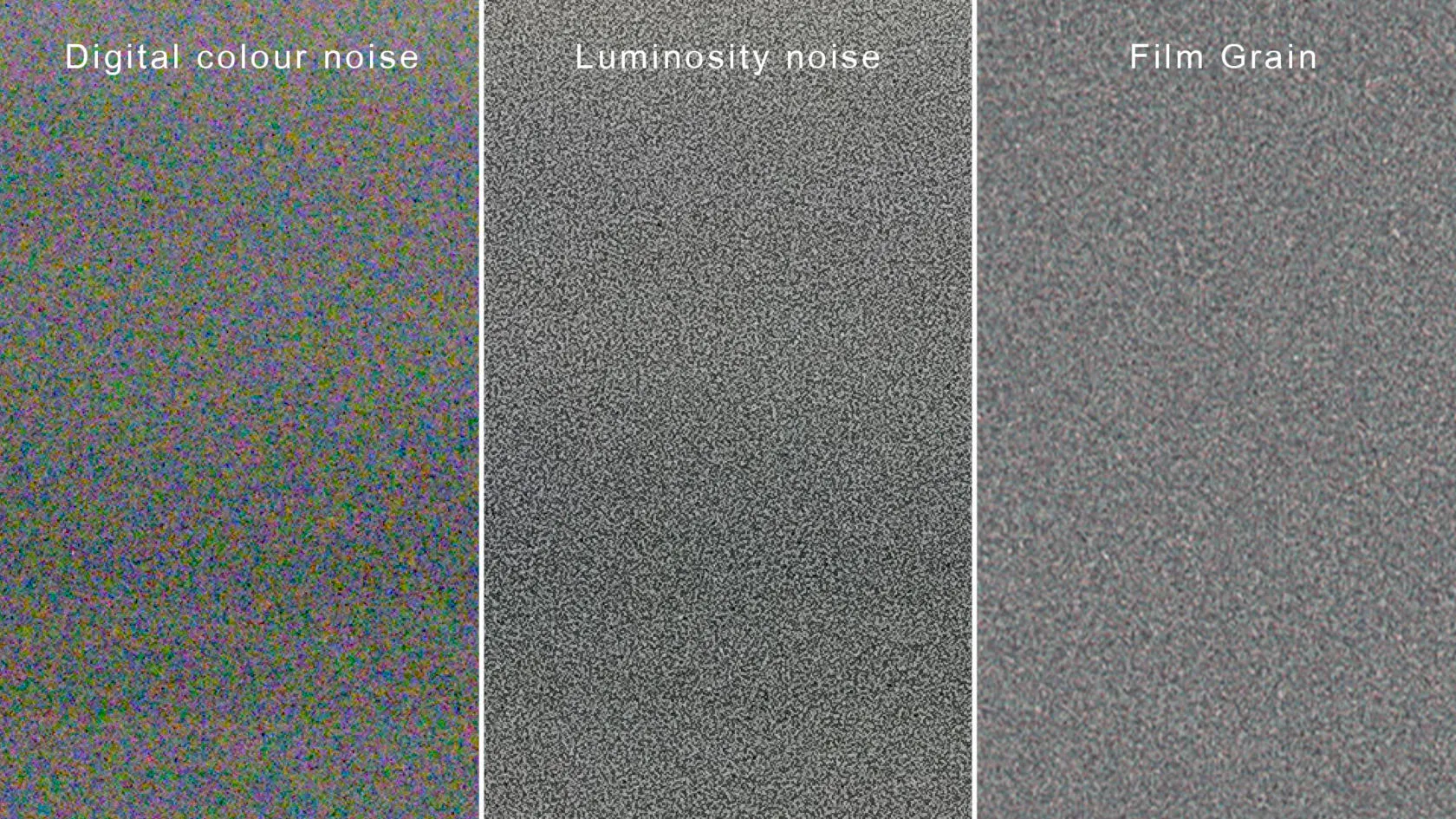 In de bovenstaande afbeelding laten de eerste twee voorbeelden zien van de digitale ruis die beelden met een hogere ISO weergeeft. De derde toont hun naaste visuele structuur, traditionele film ruis.