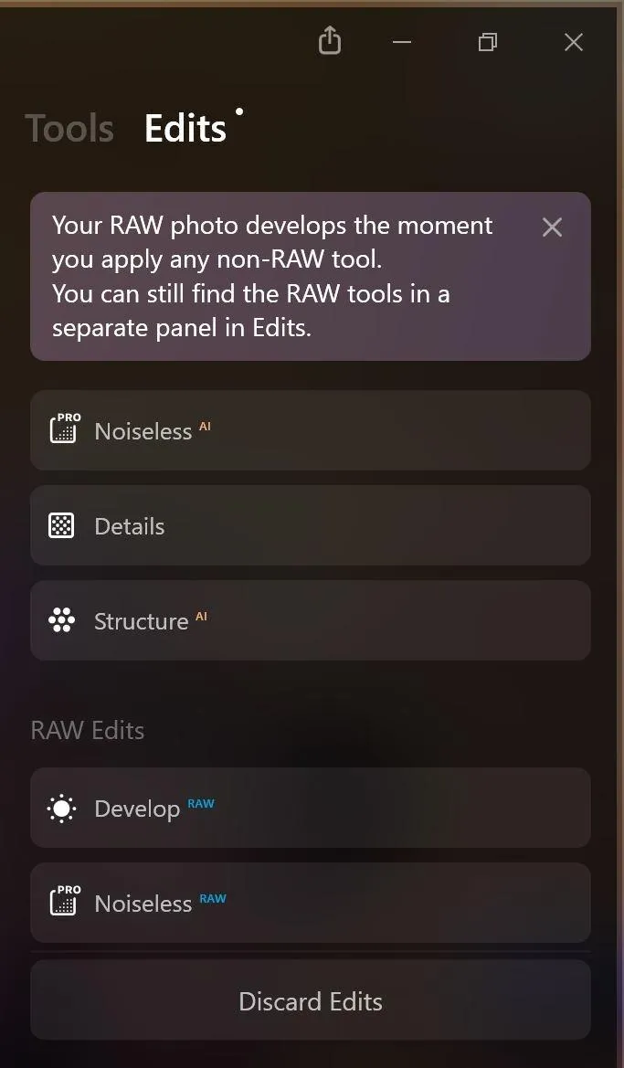 U zult het verschil kennen omdat de titel van het gereedschap zal veranderen afhankelijk van waar u zich in het bewerkingsproces bevindt. Ruisloos zal worden toegevoegd met de tekst “RAW” om u te laten weten dat het werkt aan het onbewerkte bestand. Als u tijdens de verwerking deze heeft gebruikt, weet u dat de tool nu RuisloosAI heet. Als u in het begin bent vergeten RuisloosRAW toe te passen, kunt u altijd terugkeren naar het instrument via het tabblad Bewerkingen. Het zal beschikbaar zijn onderaan de stapel naast de DevelopRAW-tool (op voorwaarde dat u een onbewerkte foto gebruikt in plaats van een jpeg).
