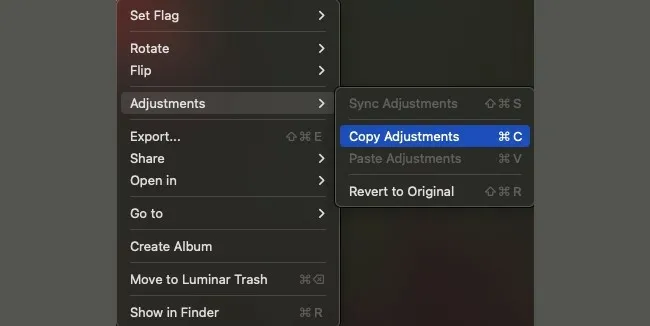 Once the correction is complete, you can copy the white balance settings. Right-click the photo in the Luminar Neo Catalog module, and select Adjustments > Copy Adjustments.