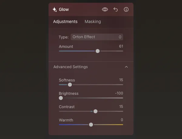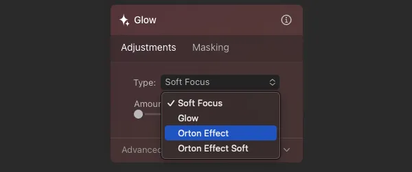 Select the Glow tool in the Creative section. There are four types of Glow tools to choose from: Soft Focus, Glow, Orton Effect, and Soft Orton Effect.