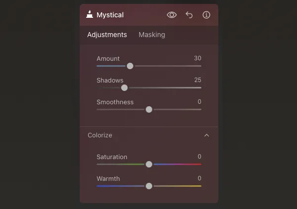 By the way, with the Mystical tool, in addition to the Amount, you can also adjust the Shadows, Smoothness, Saturation, and Warmth.