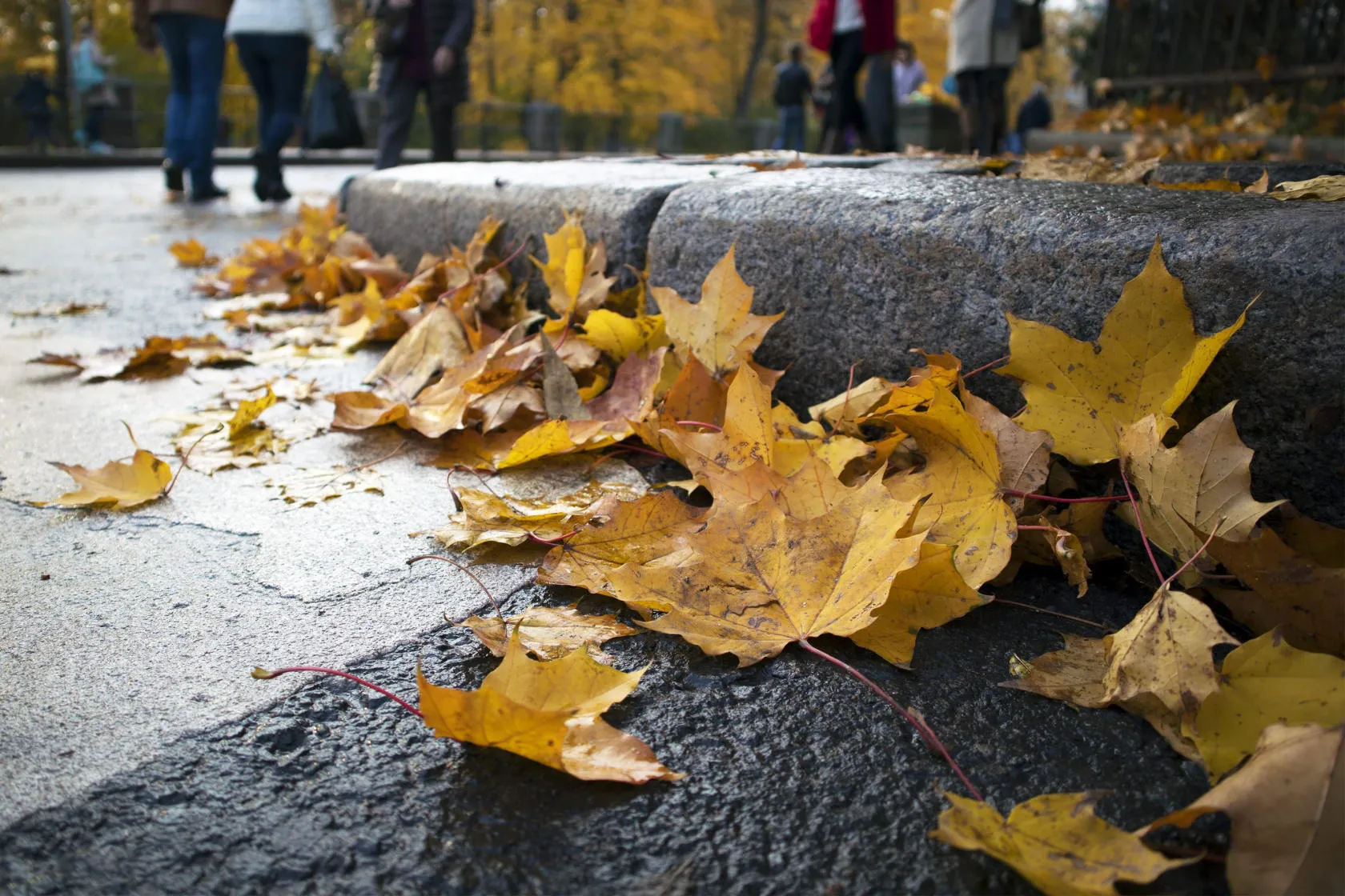 Have you ever imagined how the city looks from the sidewalk level? It’s an amazing world at our feet. Find a good and safe spot in the middle of the city and install your camera on the sidewalk. Bring a camera with a flip screen and a remote shutter release. Observe what catches your eye: people’s feet, pidgins, garbage, cars, etc. If you’re looking for fall photoshoot ideas, photograph leaves and rain. If you choose a rainy day, photograph reflections in the water.