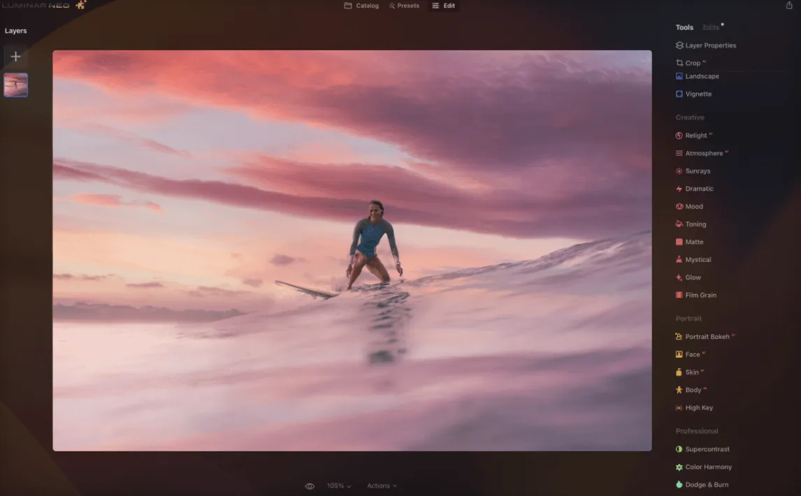 One of the best Pixlr alternatives is Luminar Neo. It is an AI-powered photo editor suitable for users of any level of experience. You can edit your pictures quickly thanks to one-click Presets that boast a variety of styles. It also includes easy AI editing tools, like Mask AI for making automatic selections, Sky AI for replacing the sky in one click, or Face AI for easy portrait retouching. Luminar Neo also supports Layers for more precise editing and creative exploration.
