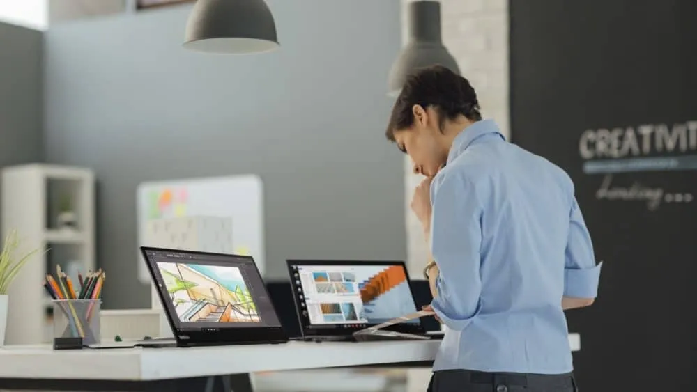 - You can set up a dual-screen workstation anywhere, whether you’re in a coffee shop, co-working space, or on a business trip.