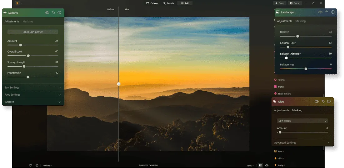 If you missed the golden hour, don’t worry — you can still get that warm, golden glow with Luminar Neo! Just use the golden hour photo edit feature, which lets you add the filter with a quick slide!