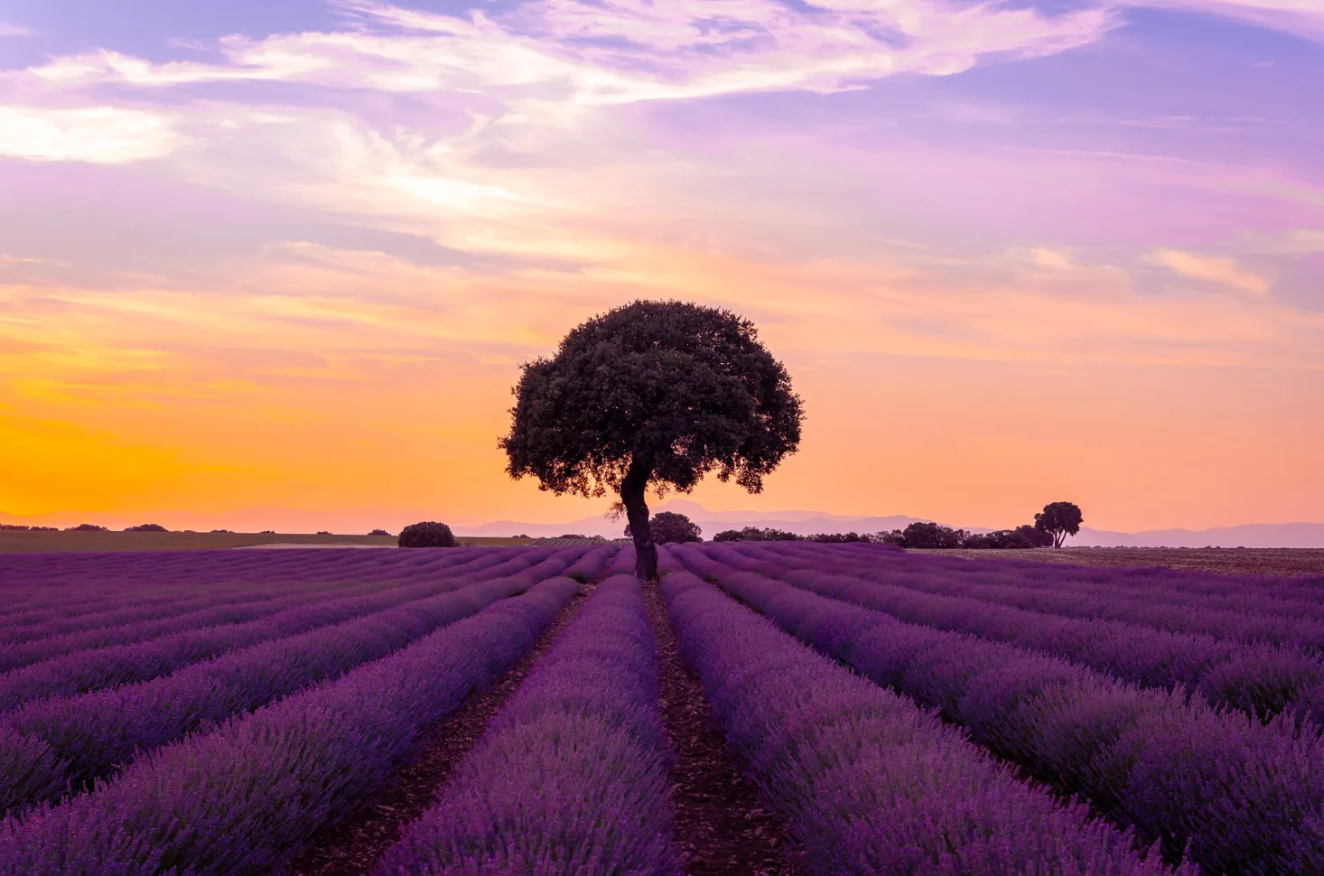 Example: A photo of a single tree framed by lavender rows that stretch into the distance. These natural leading lines draw the eye straight to the tree, creating depth and focus in the composition.