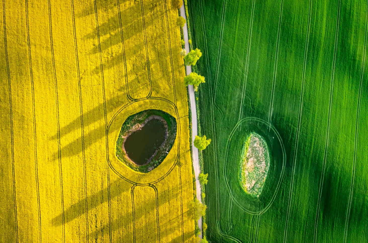 Example: In this aerial shot, a winding road lined with clusters of three trees creates natural balance across the frame. Their odd number subtly draws the viewer’s eye from the golden field on the left into the vibrant green on the right, adding rhythm and harmony to the landscape.