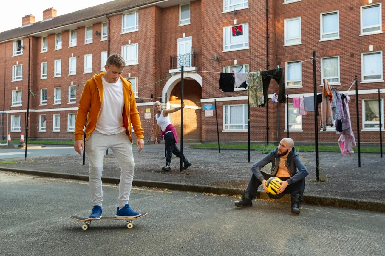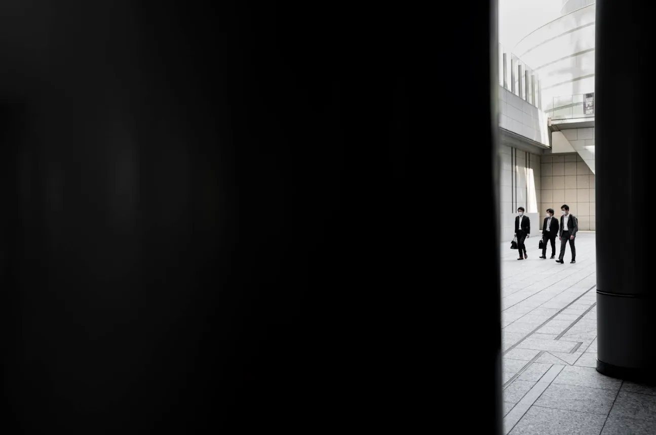 Focus on capturing three subjects in motion, like three people walking together or a person framed between two others.