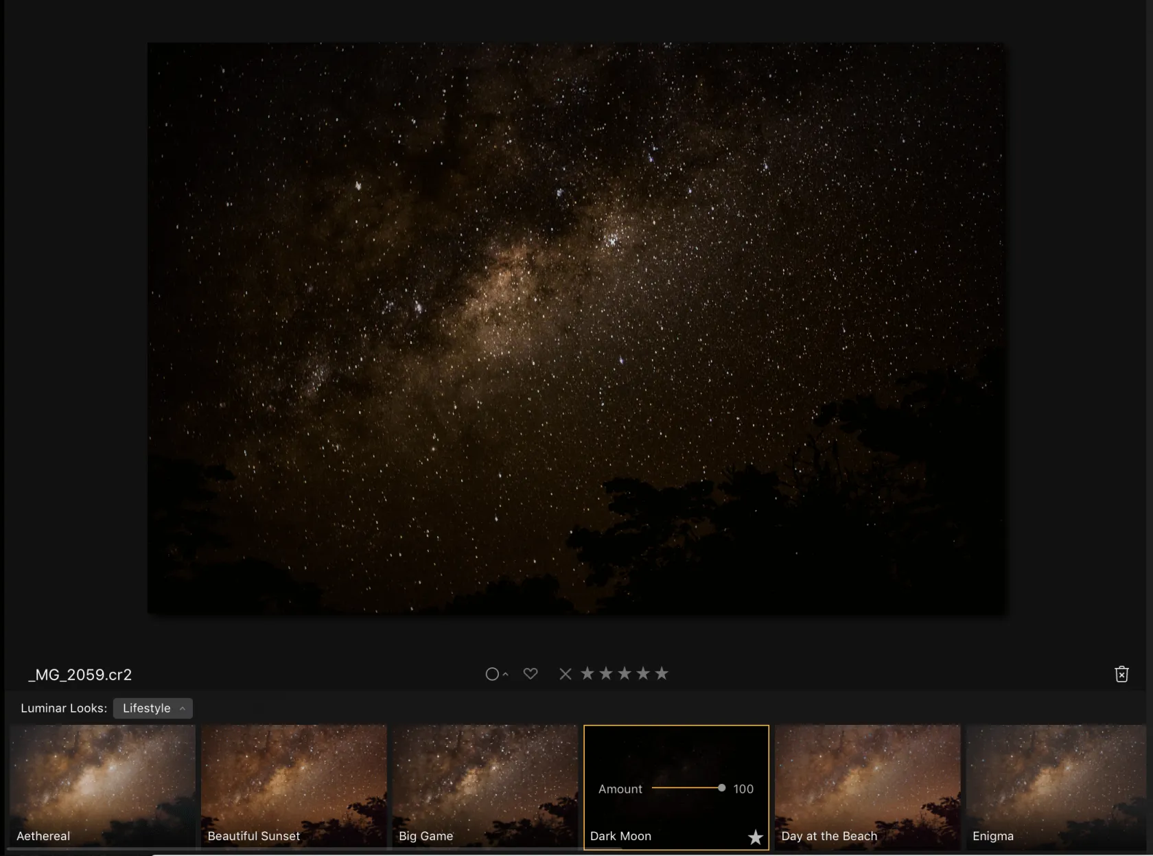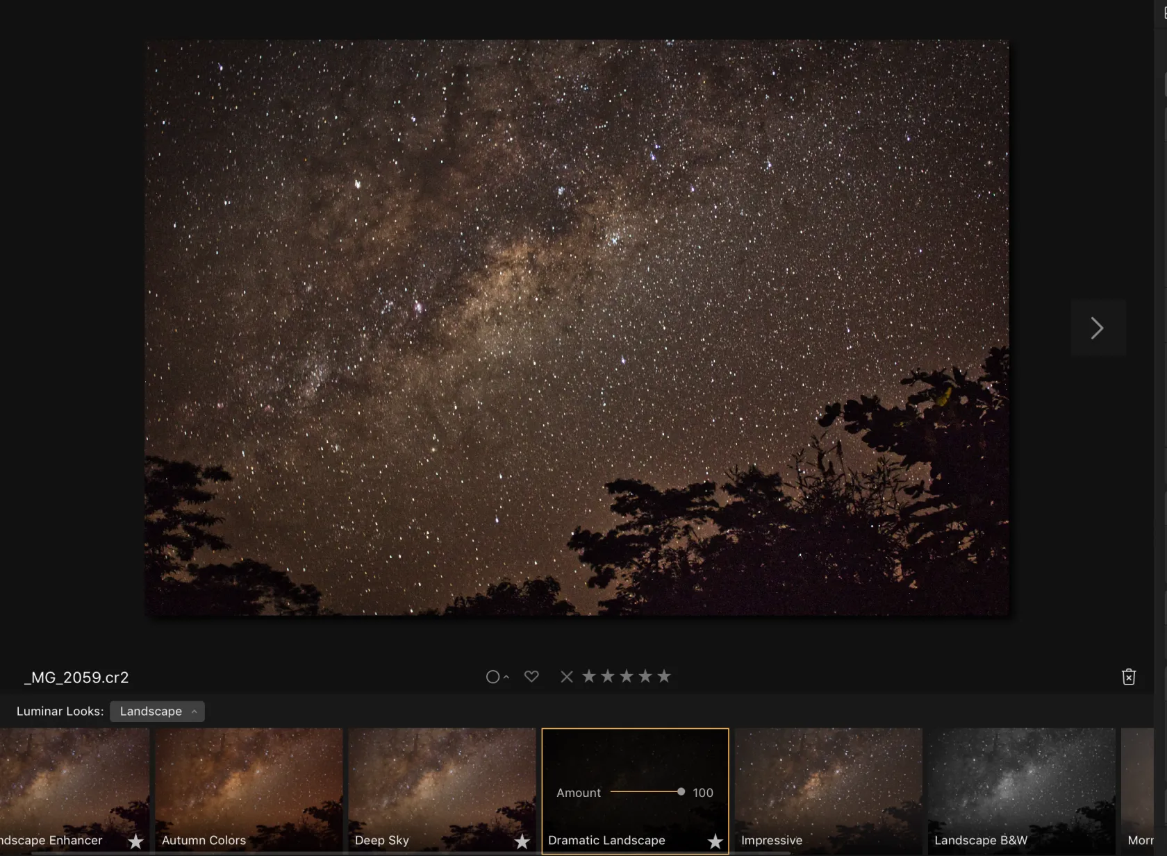 Another great preset to try for night sky images is Dramatic Landscape. Can you see how one simple click instantly brought even more stars into the image? All of the dim stars are instantly lightened and sharpened, making the image more dramatic. By the way, you can try panoramic stitching software if you work with landscapes.