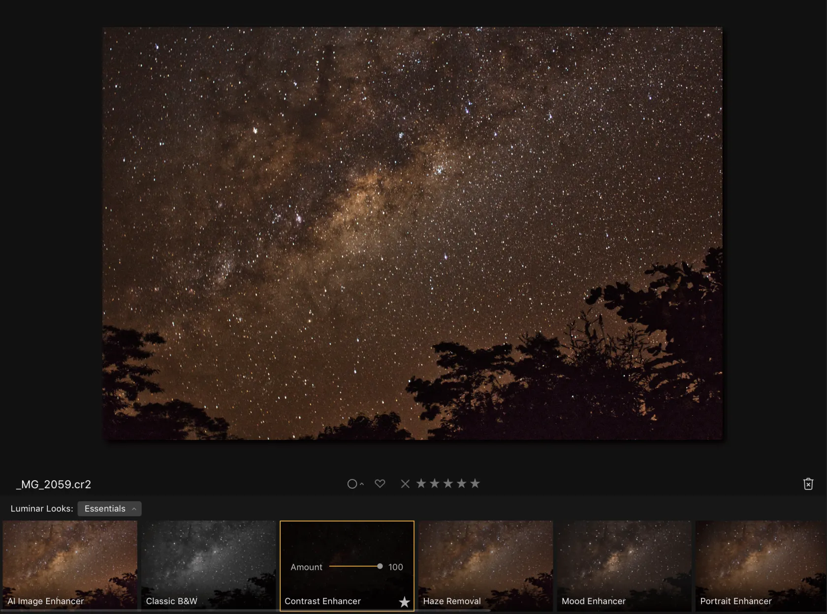 The Contrast Enhancer offers a more natural boost. In the original photograph, there was a bit of haze over the image and the stars weren’t very sharp. Using this option, the stars are much sharper, the contrast is more appealing, and interesting red and purple tones have been drawn out. This tool instantly boosts the night sky without making the overall image too dark.