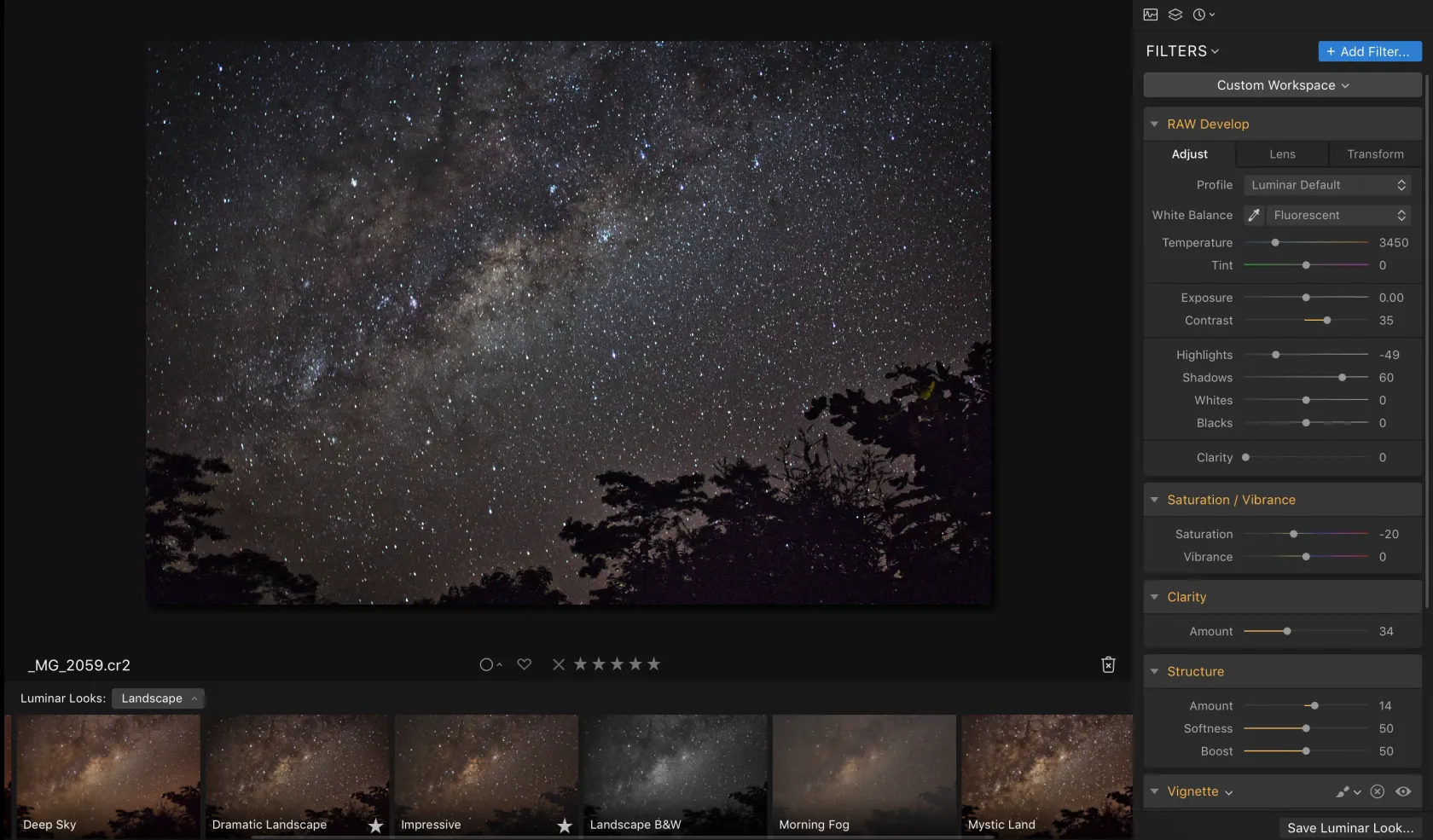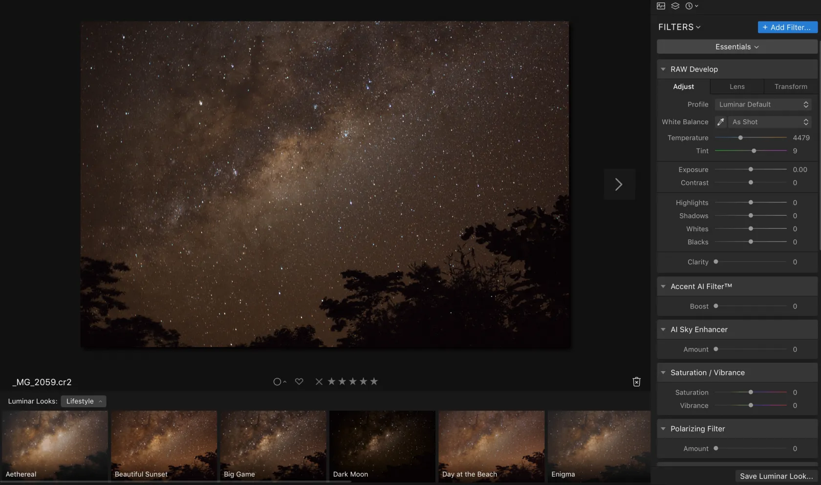 The Milky Way and the stars are pretty easy to spot in this image, but perhaps the overall tone is a little warm. In this case, you can use the right-hand panel to adjust the white balance. Using the drop-down menu, you can instantly change the white balance by choosing shade, daylight, fluorescent, etc. In this case, I’ve chosen the fluorescent white balance to add cooler tones to the image.